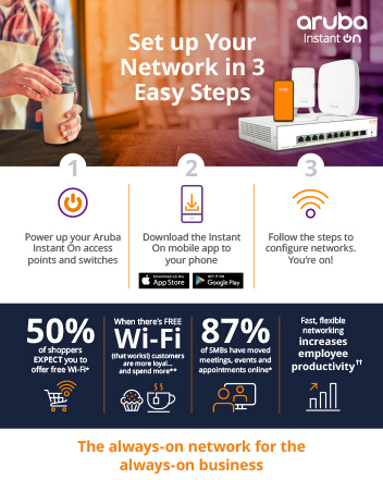 Aruba Instant On gets you and your customers online in no time, with ‘set-it-and-forget-it’ simplicity. See how easy it is.