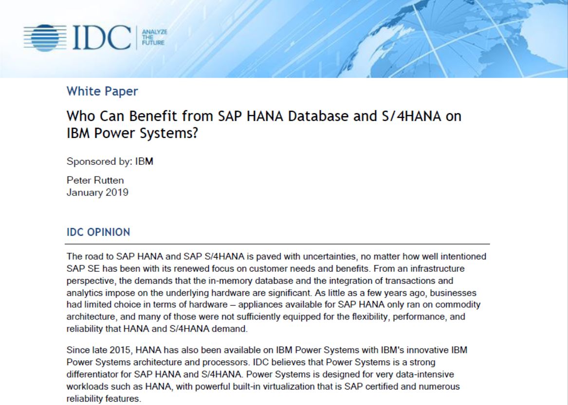 IDC White Paper on "Who can benefit from SAP Hana database on IBM Power Systems" analyzes the below: